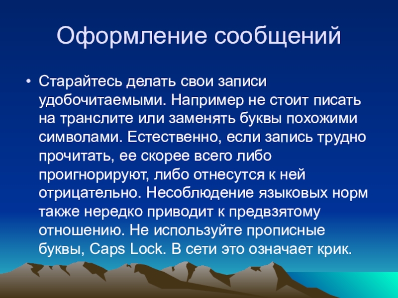 Оформление сообщений Старайтесь делать свои записи удобочитаемыми. Например не стоит писать на транслите или заменять буквы похожими