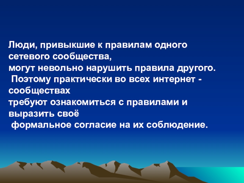 Люди, привыкшие к правилам одного сетевого сообщества,могут невольно нарушить правила другого. Поэтому практически во всех интернет -сообществах