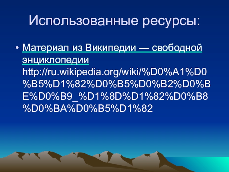 Использованные ресурсы:Материал из Википедии — свободной энциклопедииМатериал из Википедии — свободной энциклопедии http://ru.wikipedia.org/wiki/%D0%A1%D0%B5%D1%82%D0%B5%D0%B2%D0%BE%D0%B9_%D1%8D%D1%82%D0%B8%D0%BA%D0%B5%D1%82