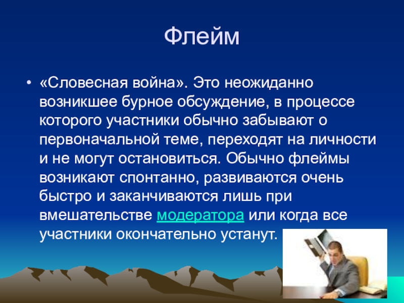 Флейм «Словесная война». Это неожиданно возникшее бурное обсуждение, в процессе которого участники обычно забывают о первоначальной теме,