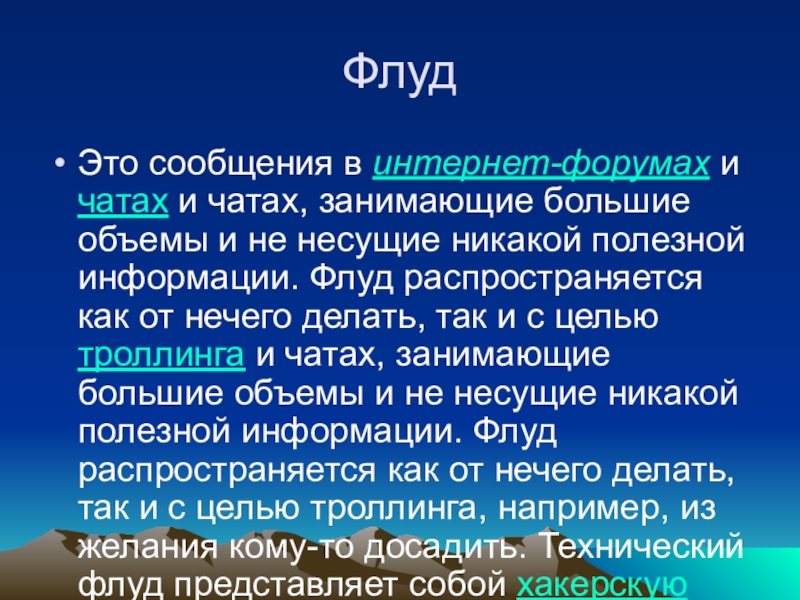 Флуд Это сообщения в интернет-форумах и чатах и чатах, занимающие большие объемы и не несущие никакой полезной
