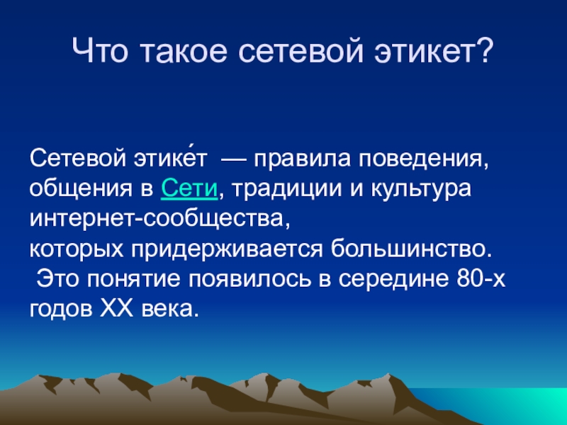 Что такое сетевой этикет?Сетевой этике́т  — правила поведения, общения в Сети, традиции и культура интернет-сообщества, которых придерживается большинство. Это понятие появилось в середине 80-х годов XX века.