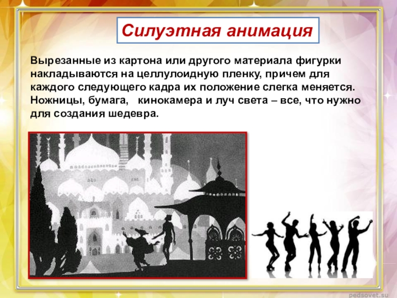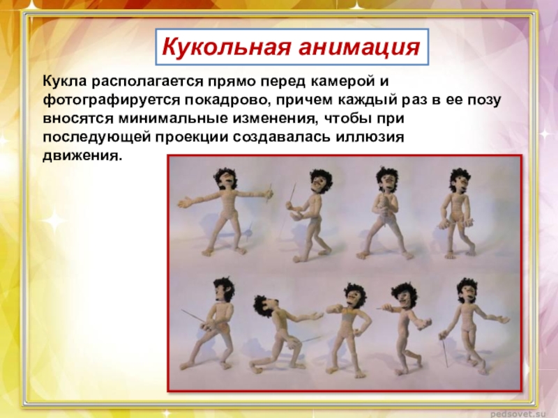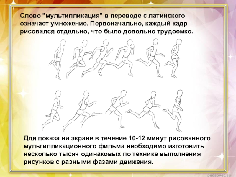 Для показа на экране в течение 10-12 минут рисованного мультипликационного фильма необходимо изготовить несколько тысяч одинаковых по технике выполнения рисунков с разными фазами движения.