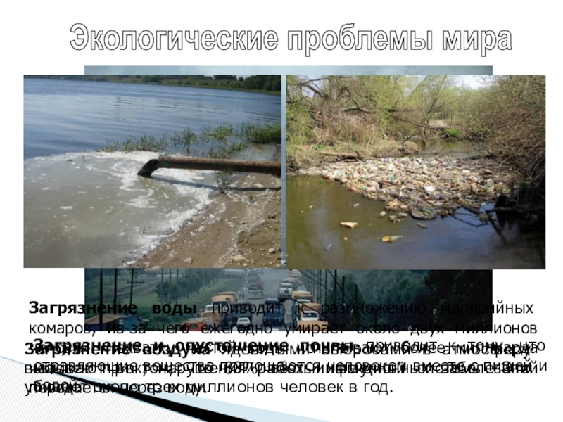 Загрязнение воды приводит к размножению малярийных комаров, из-за чего ежегодно умирает около двух миллионов человек. Нехватку чистой воды испытывают более миллиарда человек при том, что 80% всех инфекционных заболеваний передается через воду.