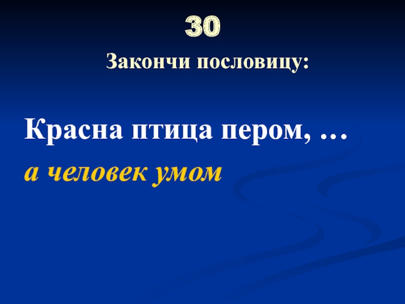 30  Закончи пословицу:Красна птица пером, …а человек умом