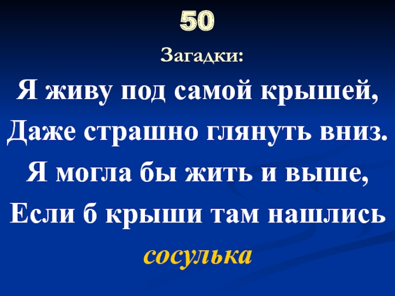 50  Загадки:Я живу под самой крышей,Даже страшно глянуть вниз.Я могла бы жить и выше,Если б крыши