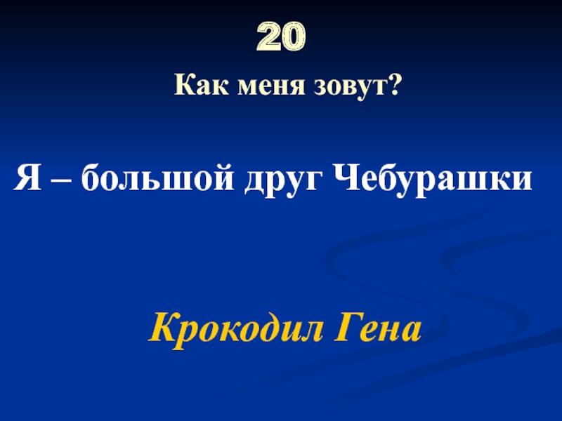20  Как меня зовут?Я – большой друг ЧебурашкиКрокодил Гена