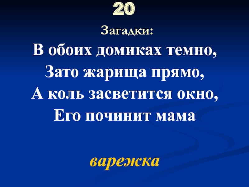20  Загадки:В обоих домиках темно,Зато жарища прямо,А коль засветится окно,Его починит мамаварежка