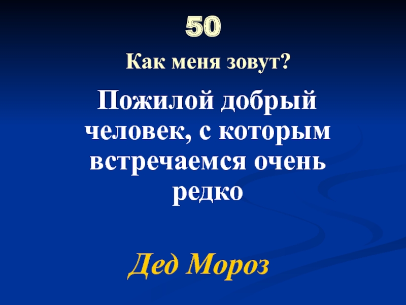 50  Как меня зовут? Пожилой добрый человек, с которым встречаемся очень редкоДед Мороз