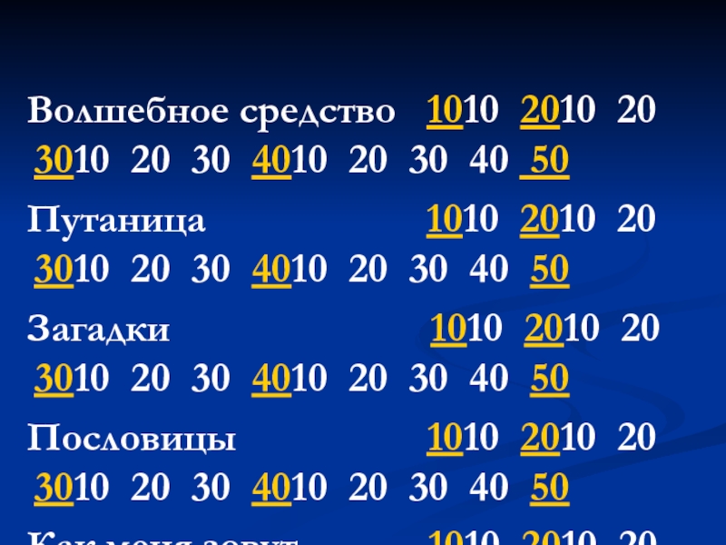 Волшебное средство 1010 2010 20 3010 20 30 4010 20 30 40 50 Путаница 1010 2010 20 3010 20 30 4010 20 30 40