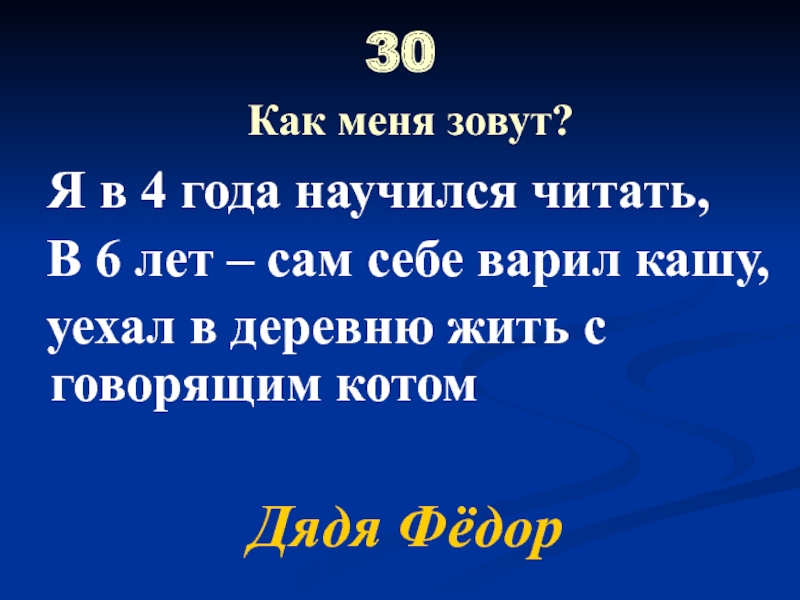 30  Как меня зовут? Я в 4 года научился читать, В 6 лет – сам себе