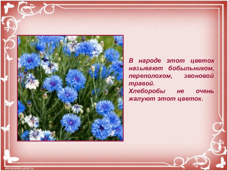 Слайд 3В народе этот цветок называют бобыльником, переполохом, звоновой травой. Хлеборобы не