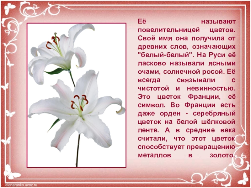Слайд 6Её называют повелительницей цветов. Своё имя она получила от древних слов,