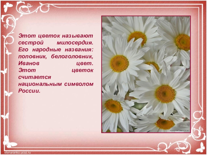 Слайд 2Этот цветок называют сестрой милосердия. Его народные названия: поповник, белоголовник, Иванов