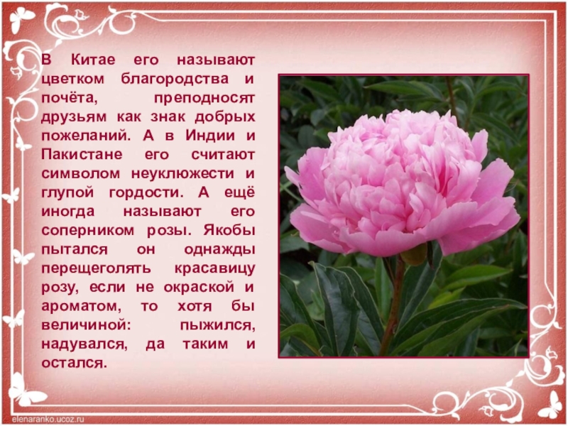 знак добрых пожеланий. А в Индии и Пакистане его считают символом неуклюжести и глупой гордости. А ещё иногда называют его соперником розы. Якобы пытался он однажды перещеголять красавицу розу, если не окраской и ароматом, то хотя бы величиной: пыжился, надувался, да таким и остался.