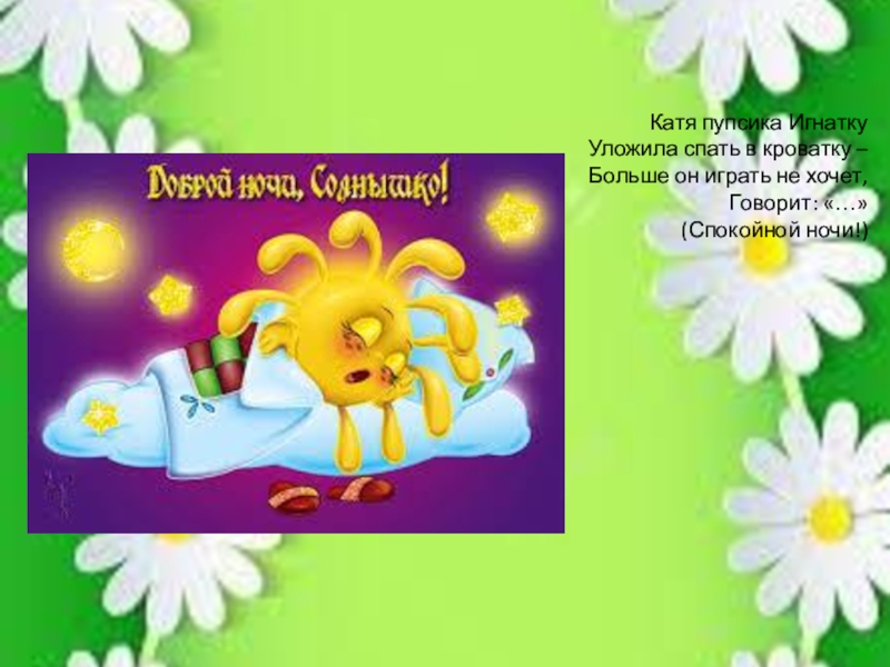 Катя пупсика Игнатку Уложила спать в кроватку – Больше он играть не хочет, Говорит: «…» (Спокойной ночи!)