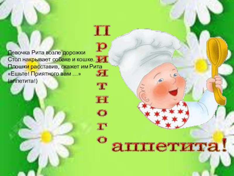 Слайд 9Девочка Рита возле дорожки Стол накрывает собаке и кошке. Плошки расставив, скажет им