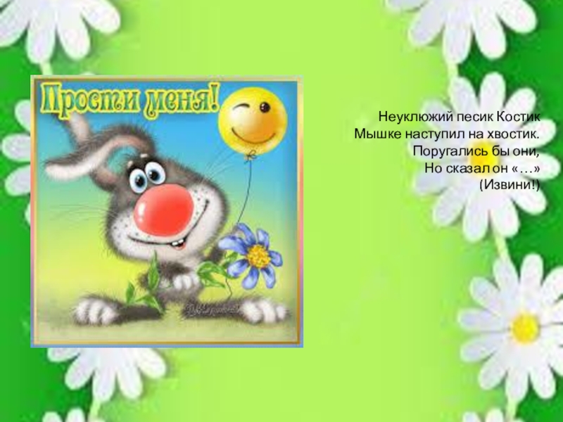 Слайд 4Неуклюжий песик Костик Мышке наступил на хвостик. Поругались бы они, Но сказал он «…» (Извини!)