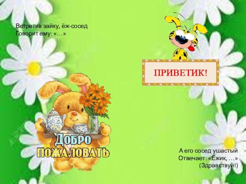 А его сосед ушастый Отвечает: «Ёжик, …» (Здравствуй!)
