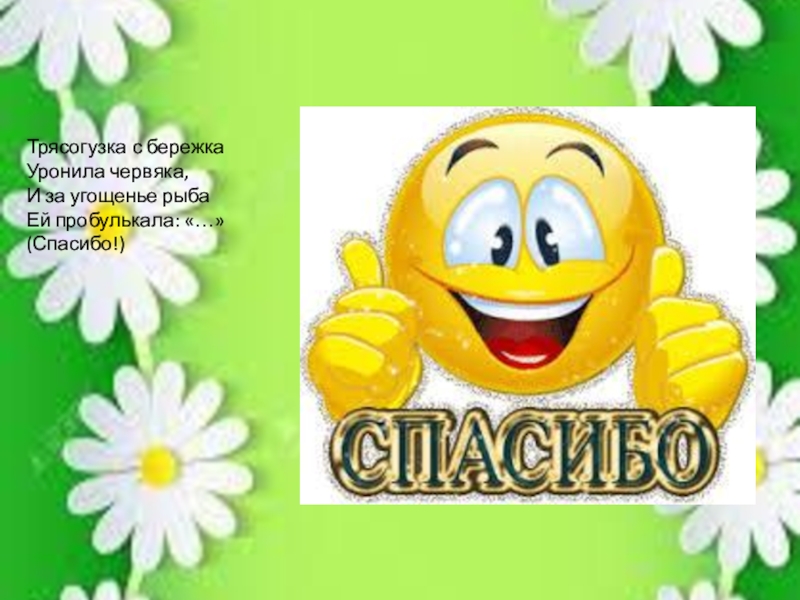 Слайд 5Трясогузка с бережка Уронила червяка, И за угощенье рыба Ей пробулькала: «…» (Спасибо!)