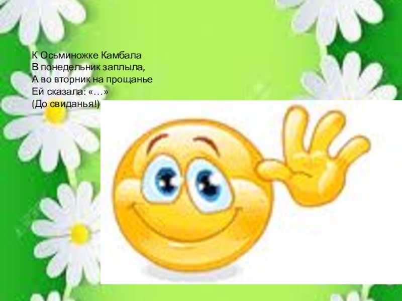 Слайд 3К Осьминожке Камбала В понедельник заплыла, А во вторник на прощанье Ей сказала: «…» (До