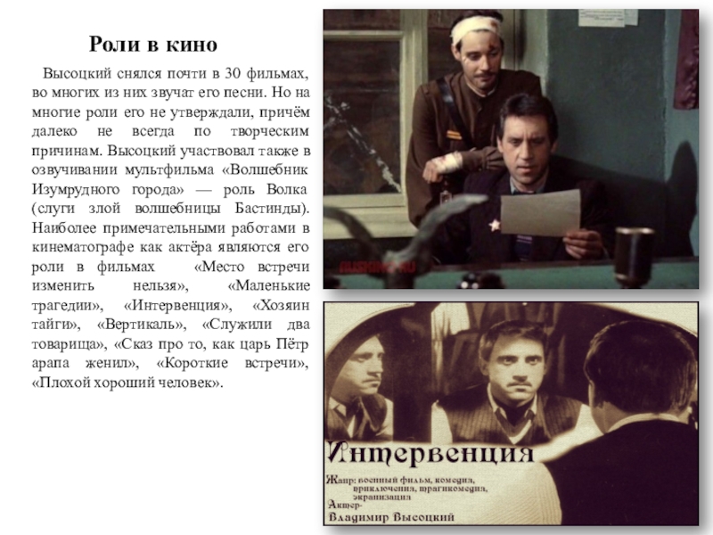 фильмах, во многих из них звучат его песни. Но на многие роли его не утверждали, причём далеко не всегда по творческим причинам. Высоцкий участвовал также в озвучивании мультфильма «Волшебник Изумрудного города» — роль Волка (слуги злой волшебницы Бастинды). Наиболее примечательными работами в кинематографе как актёра являются его роли в фильмах «Место встречи изменить нельзя», «Маленькие трагедии», «Интервенция», «Хозяин тайги», «Вертикаль», «Служили два товарища», «Сказ про то, как царь Пётр арапа женил», «Короткие встречи», «Плохой хороший человек».