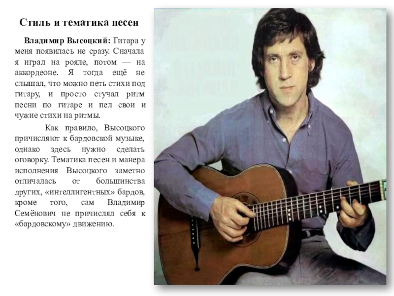 Владимир Высоцкий вошёл в историю как автор-исполнитель своих песен под русскую семиструнную гитару.