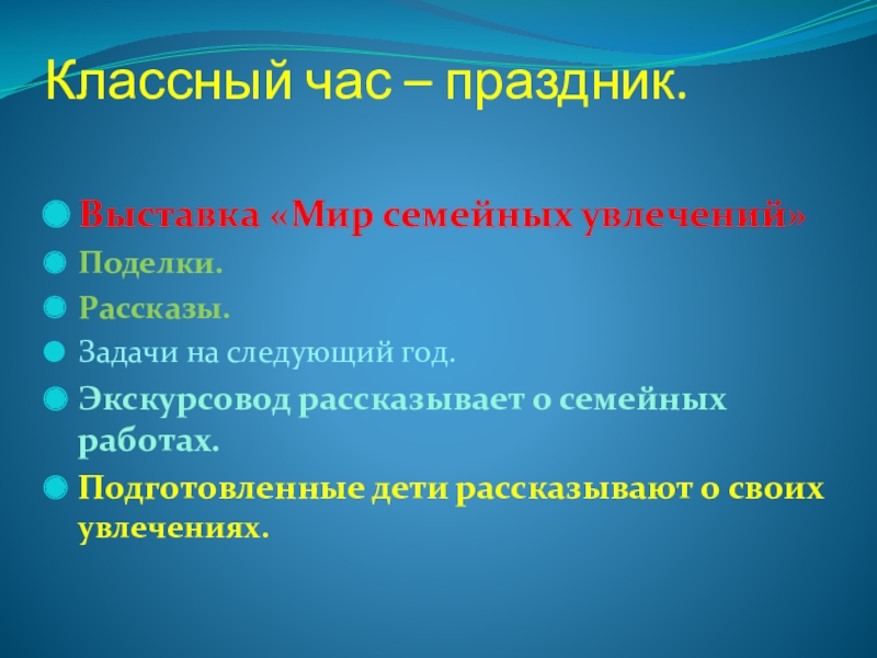 Классный час – праздник.  Выставка «Мир семейных увлечений»Поделки.Рассказы.Задачи на следующий год.Экскурсовод рассказывает о семейных работах.Подготовленные дети
