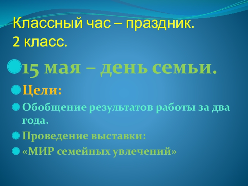 Классный час – праздник. 2 класс.15 мая – день семьи.Цели:Обобщение результатов работы за два года.Проведение выставки: «МИР семейных увлечений»