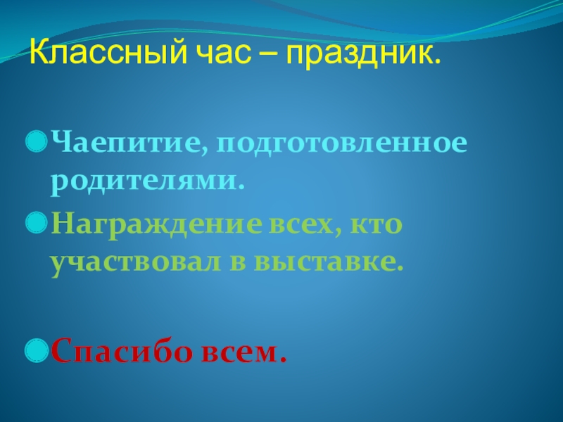 Классный час – праздник.  Чаепитие, подготовленное родителями.Награждение всех, кто участвовал в выставке.Спасибо всем.