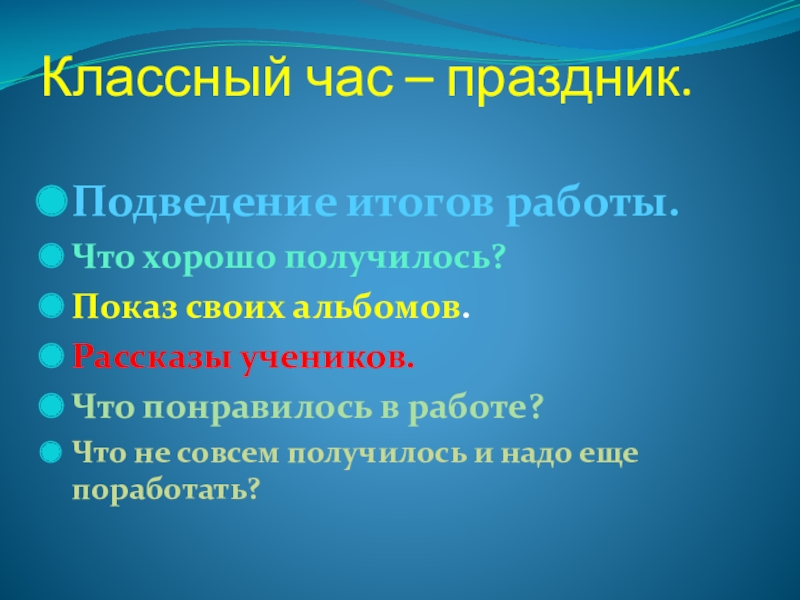 Классный час – праздник.  Подведение итогов работы.Что хорошо получилось?Показ своих альбомов.Рассказы учеников.Что понравилось в работе?Что не