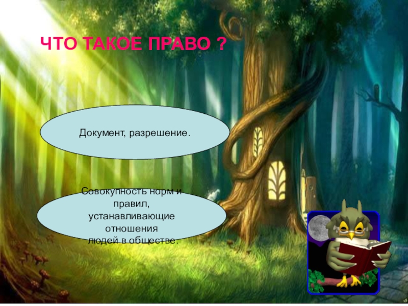 ЧТО ТАКОЕ ПРАВО ?Документ, разрешение. Совокупность норм и правил, устанавливающие отношения людей в обществе.