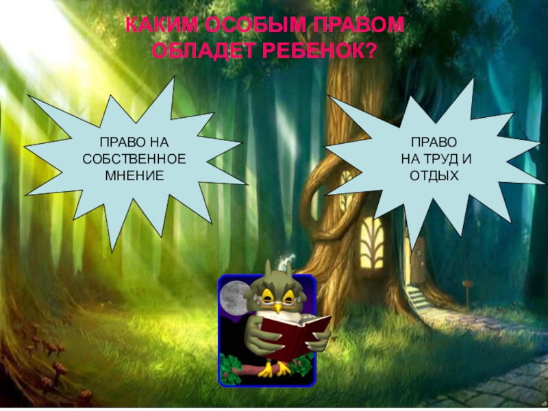 КАКИМ ОСОБЫМ ПРАВОМ ОБЛАДЕТ РЕБЕНОК?ПРАВО НА СОБСТВЕННОЕ МНЕНИЕПРАВО НА ТРУД И ОТДЫХ