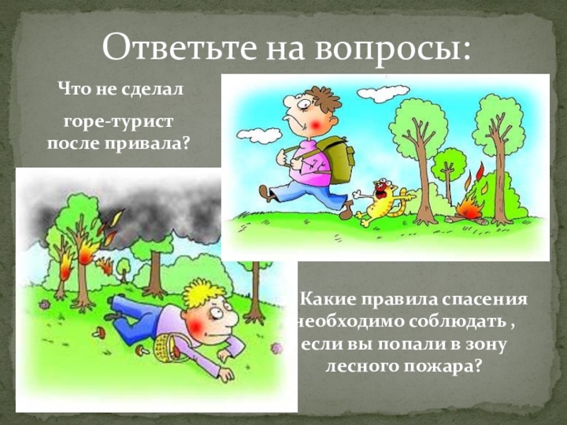 Ответьте на вопросы: Что не сделал горе-турист после привала?2. Какие правила спасения необходимо соблюдать , если вы попали в зону лесного пожара?
