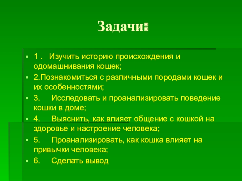 1 . Изучить историю происхождения и одомашнивания кошек;
