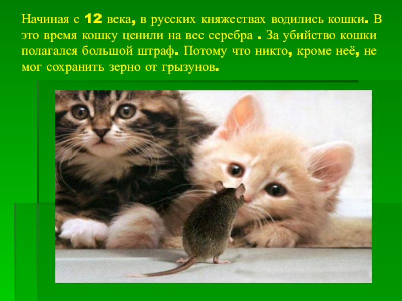 Слайд 6Начиная с 12 века, в русских княжествах водились кошки. В это
