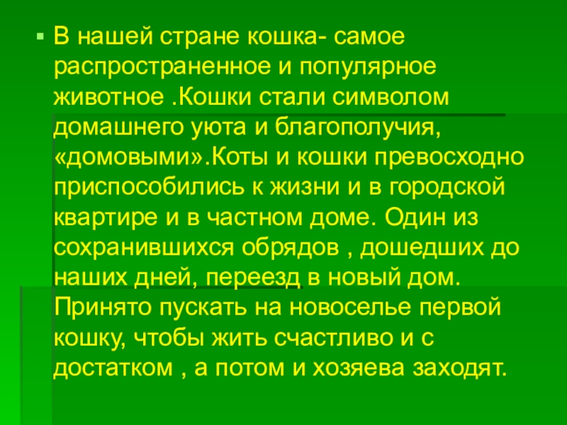 символом домашнего уюта и благополучия,«домовыми».Коты и кошки превосходно приспособились к жизни и в городской квартире и в частном доме. Один из сохранившихся обрядов , дошедших до наших дней, переезд в новый дом. Принято пускать на новоселье первой кошку, чтобы жить счастливо и с достатком , а потом и хозяева заходят.
