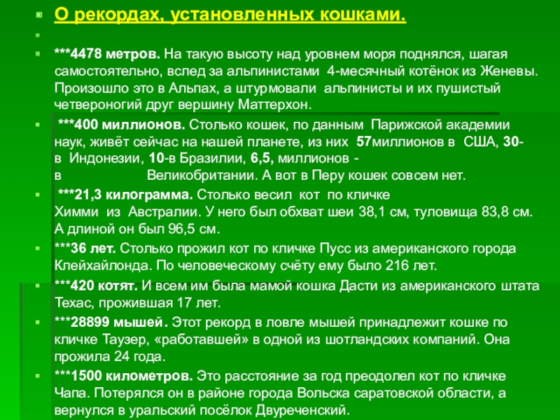***28899 мышей. Этот рекорд в ловле мышей принадлежит кошке по кличке Таузер, «работавшей» в одной из шотландских компаний. Она прожила 24 года.