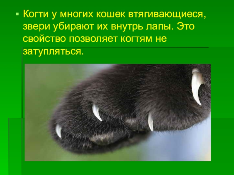 Слайд 22Когти у многих кошек втягивающиеся, звери убирают их внутрь лапы. Это