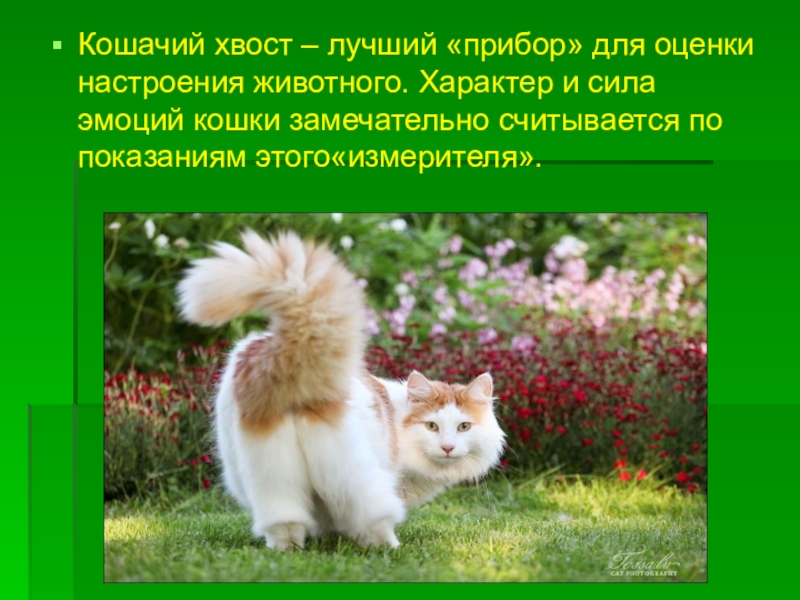 Слайд 21Кошачий хвост – лучший «прибор» для оценки настроения животного. Характер и