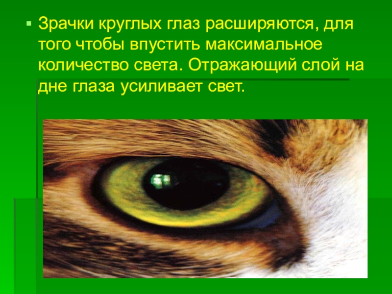 Слайд 20Зрачки круглых глаз расширяются, для того чтобы впустить максимальное количество света.