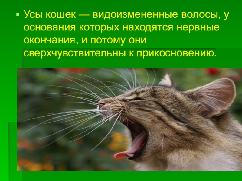 Слайд 18Усы кошек — видоизмененные волосы, у основания которых находятся нервные окончания,