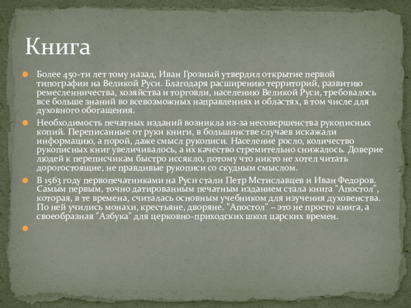 В 1563 году первопечатниками на Руси стали Петр Мстиславцев и Иван Федоров. Самым первым, точно датированным печатным изданием стала книга "Апостол", которая, в те времена, считалась основным учебником для изучения духовенства. По ней учились монахи, крестьяне, дворяне. "Апостол" – это не просто книга, а своеобразная "Азбука" для церковно-приходских школ царских времен.