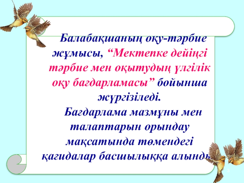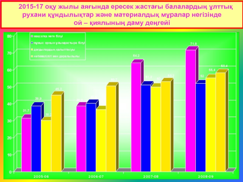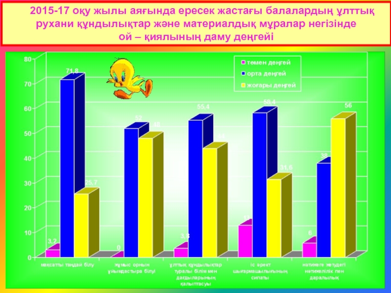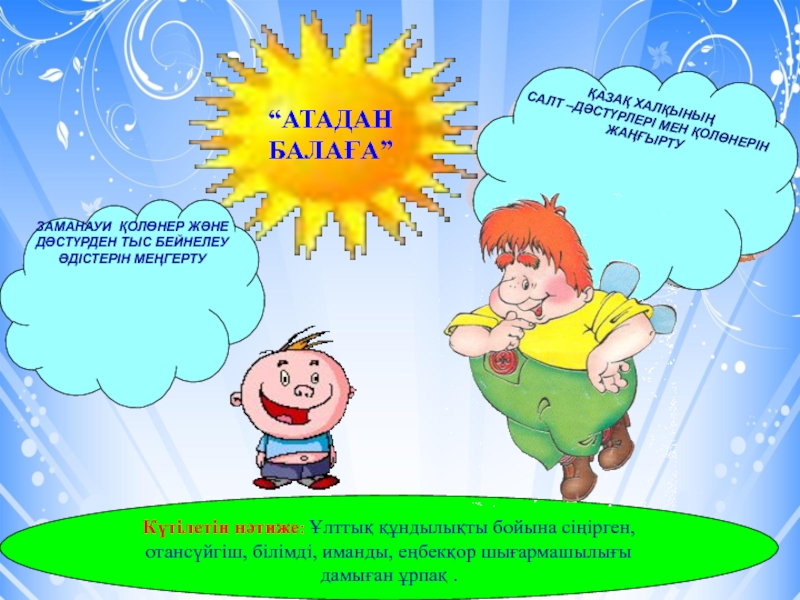 Күтілетін нәтиже: Ұлттық құндылықты бойына сіңірген, отансүйгіш, білімді, иманды, еңбекқор шығармашылығы дамыған ұрпақ .