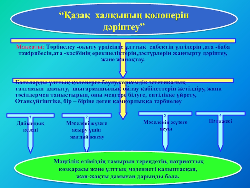 Балаларды ұлттық қолөнерге баулу,көркемдік эстетикалық талғамын дамыту, шығармашылық ойлау қабілеттерін жетілдіру, жаңа тәсілдермен таныстырып, оны меңгере білуге, ептілікке үйрету, Отансүйгіштіке, бір – біріне деген қамқорлыққа тәрбиелеу