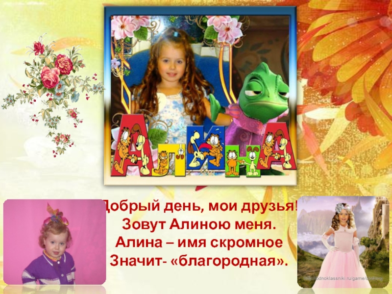 Слайд 2Добрый день, мои друзья! Зовут Алиною меня. Алина – имя скромное Значит- «благородная».