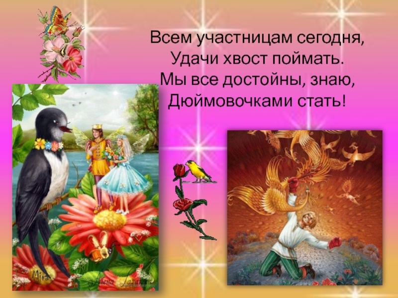Слайд 17Всем участницам сегодня, Удачи хвост поймать. Мы все достойны, знаю, Дюймовочками стать!