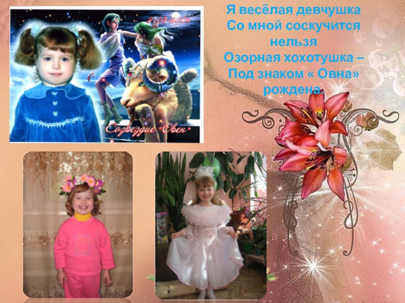 Я весёлая девчушка Со мной соскучится нельзя Озорная хохотушка – Под знаком « Овна» рождена.