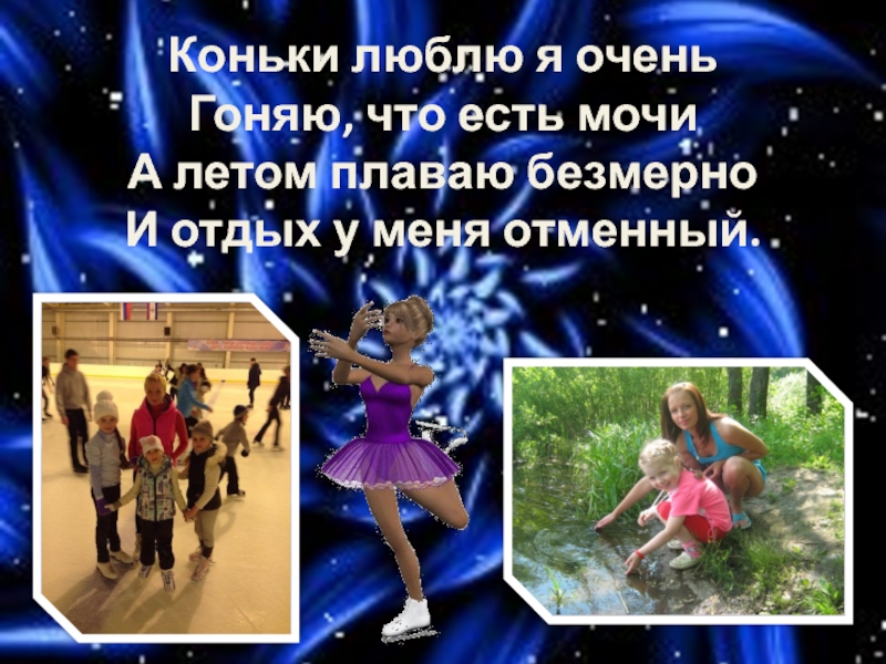 Слайд 13Коньки люблю я очень Гоняю, что есть мочи А летом плаваю безмерно И отдых