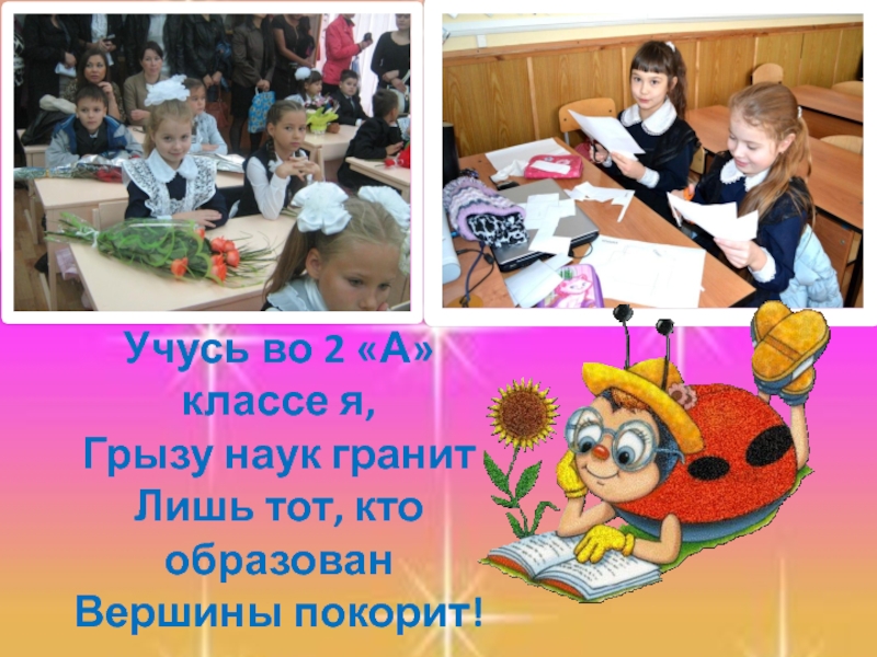 Учусь во 2 «А» классе я, Грызу наук гранит Лишь тот, кто образован Вершины покорит!